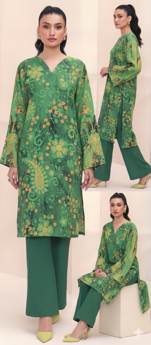2-Piece Printed Khaddar Suit – Emerald Green & Mustard